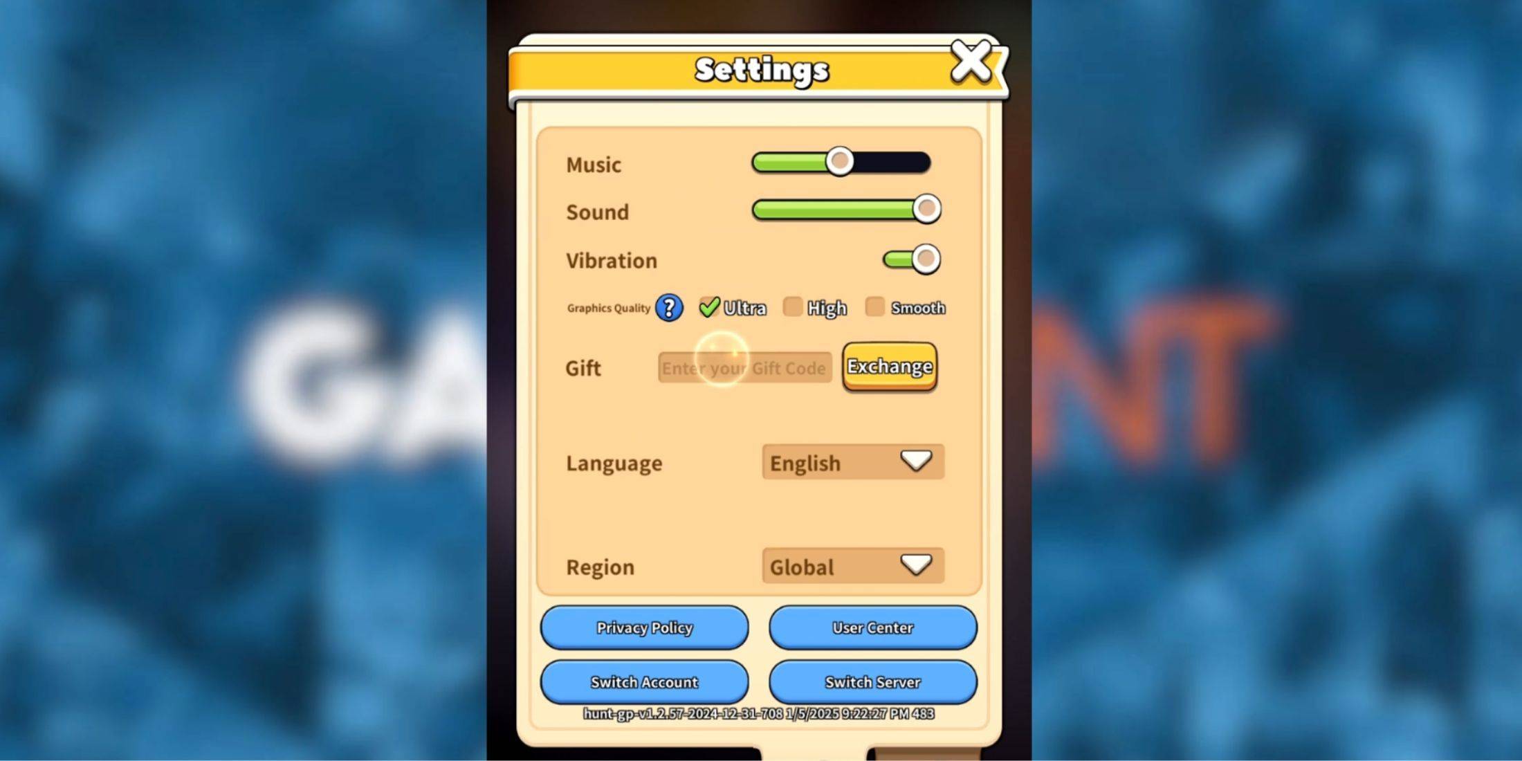 - No menu Configurações, encontre a opção de presente. Você verá um campo de entrada ao lado dele e um botão de troca amarela. Digite um dos códigos de trabalho da lista acima no campo de entrada.