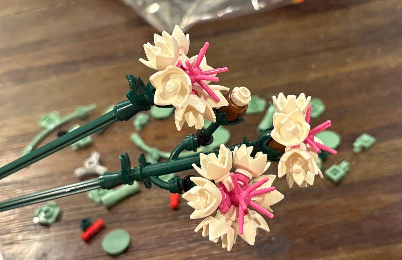 Construímos o bouquet de flores rosa bonito da LEGO