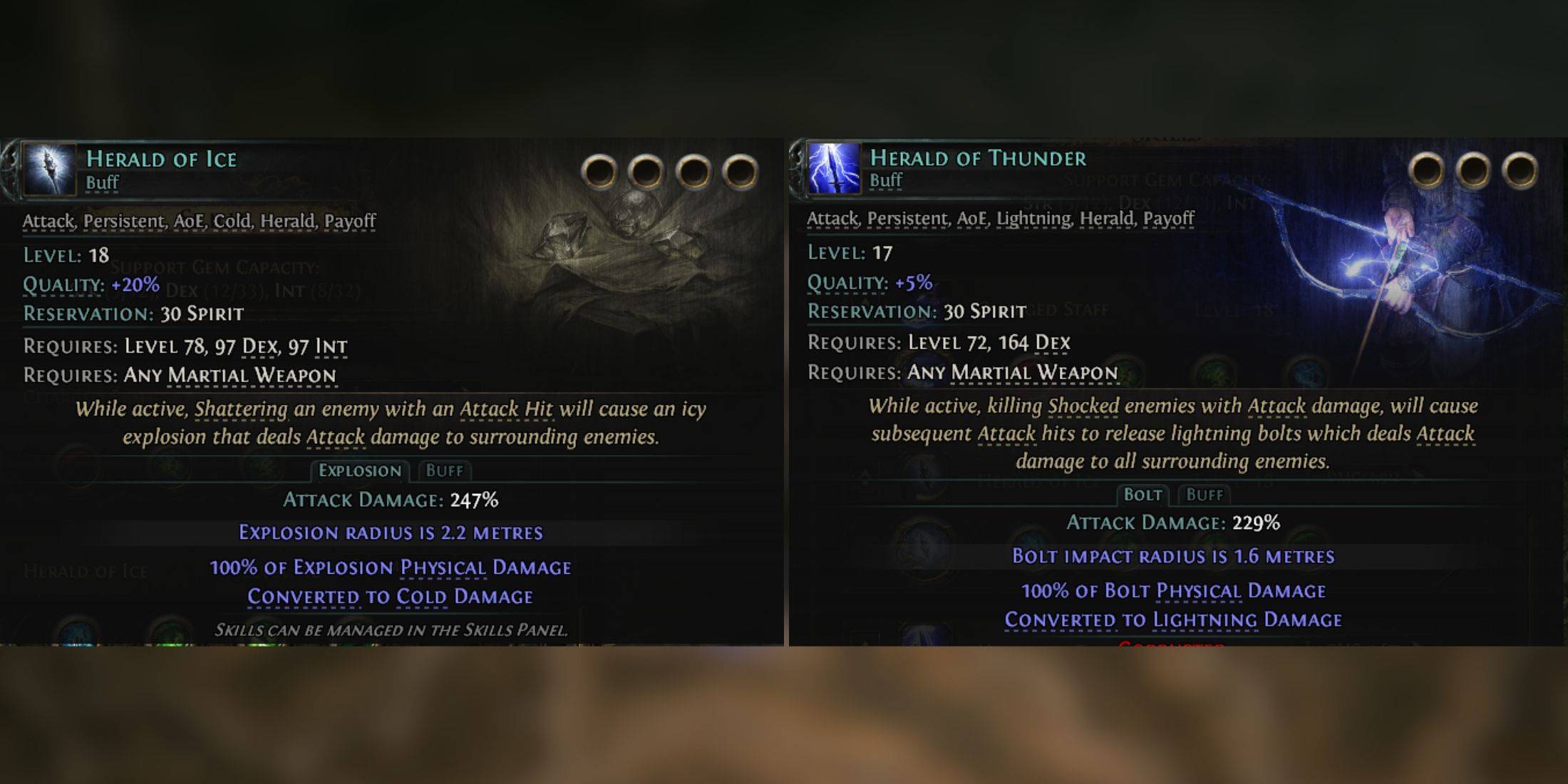 A sinergia entre esses dois arautos está em suas propriedades únicas: o Herald of Ice pode chocar os inimigos (graças à jóia de apoio à infusão de raios), enquanto o Herald of Thunder pode congelá -los (com a ajuda da jóia de suporte a infusão fria). Ao equipar essas jóias de suporte, você converte uma parte do dano de Herald of Ice ao raio, permitindo que choque e uma parte do dano de Herald of Thunder no frio, permitindo congelar.