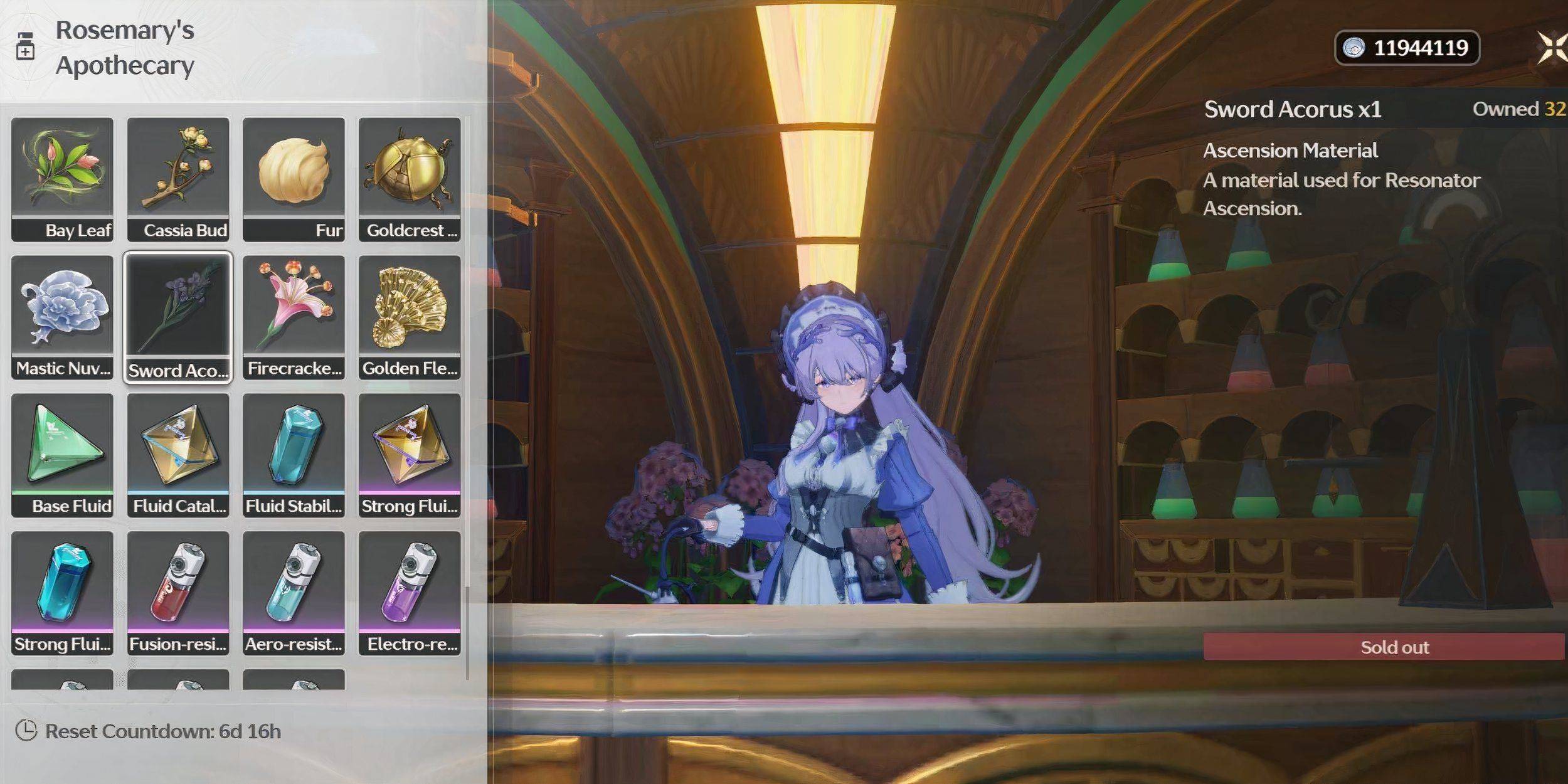 Boticário de Rosemary (perto do Beacon de ressonância) oferece um limite semanal de compra de 15 acorus de espada a 3000 créditos cada (45000 créditos pelo valor total).